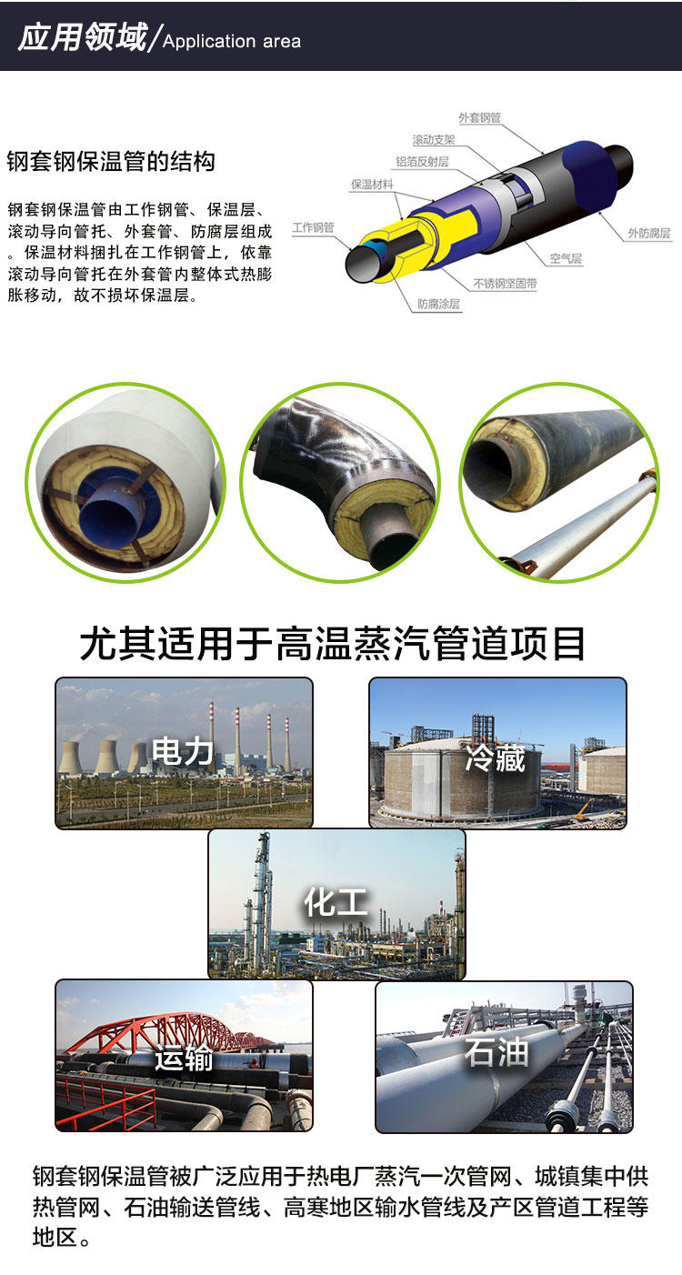 鋼套鋼保溫管產品介紹鋼套管(鋼套鋼)埋設技術是一種防水、防漏、抗滲、抗壓和全封閉的埋設新技術,是直埋敷設技術在地下水位較高地區使用的一次較大突破。它是由輸送介質的鋼管、防腐外套鋼管以及鋼管與外套鋼管之間填充的超細玻璃棉組合而成,也可采用石墨、硅鈣瓦管殼及填充聚氨酯泡沫復合而成。
